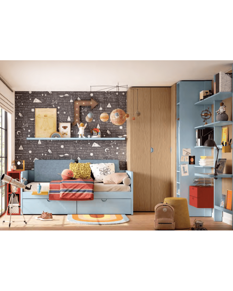 Esta composición ha sido diseñada para ofrecer un equilibrio perfecto entre orden, comodidad y diseño, ideal para quienes buscan optimizar su habitación sin renunciar al estilo. Su arcón cabezal con almacenamiento oculto es la solución perfecta para mantener todo en su lugar, mientras que la cama nido con cajones ofrece practicidad y un extra de espacio para guardar lo que necesites. Los armarios con puertas plegables y estantes aprovechan cada rincón de la habitación, combinando amplitud y organización. Además, la estantería con escritorio fijo crea un ambiente de estudio inspirador, convirtiendo este conjunto en una opción versátil y funcional. Un diseño inteligente para una habitación que se adapta a tu ritmo de vida.