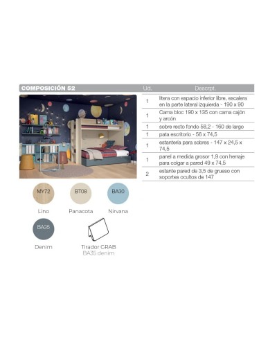 La Composición 52 redefine el descanso con una litera moderna y funcional. Su estructura permite optimizar el espacio sin renunciar al estilo, combinando una cama inferior de 135x190 para mayor comodidad y una cama superior de 90x190, accesible mediante una escalera lateral segura y práctica. La combinación de Roble Lino, Beige Panacota y Azul Nirvana aporta calidez, serenidad y un toque de frescura al ambiente, creando un dormitorio acogedor y equilibrado.