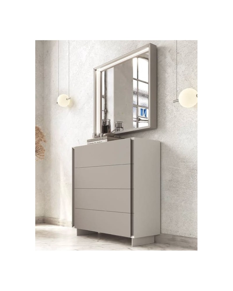 ¿Y si lo simple fuera lo más bello? La cómoda Love 04 lo demuestra con sus cuatro cajones sin tiradores, su diseño sobrio y su acabado en tonos cálidos. Coronada por un espejo de marco limpio y proporciones generosas, este conjunto refleja una estética serena y funcional, sin perder ese toque acogedor que hace del dormitorio un lugar especial.