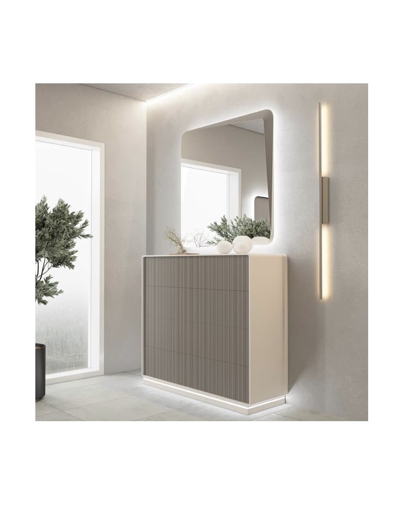 La cómoda Curve es una declaración de estilo suave y contemporáneo. Su estructura curvada, lacada en un color que abraza el diseño, contrasta con los frentes acanalados en otro tono, aportando dinamismo visual. Se complementa con un espejo cuadrado de esquinas redondeadas que incluye un original detalle lacado en relieve, en una de sus esquinas, aportando profundidad y personalidad al conjunto. Un diseño pensado para quienes valoran la armonía entre funcionalidad y estética.