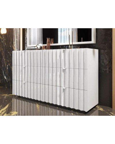Sumérgete en la elegancia y sofisticación con la colección Orión, donde el lujo se fusiona con la funcionalidad en cada detalle. Esta cómoda lacado, emblema de refinamiento, te transporta a un espacio de descanso sublime. Su principal distinción reside en sus frentes ondulados que añaden un toque de distinción y modernidad.