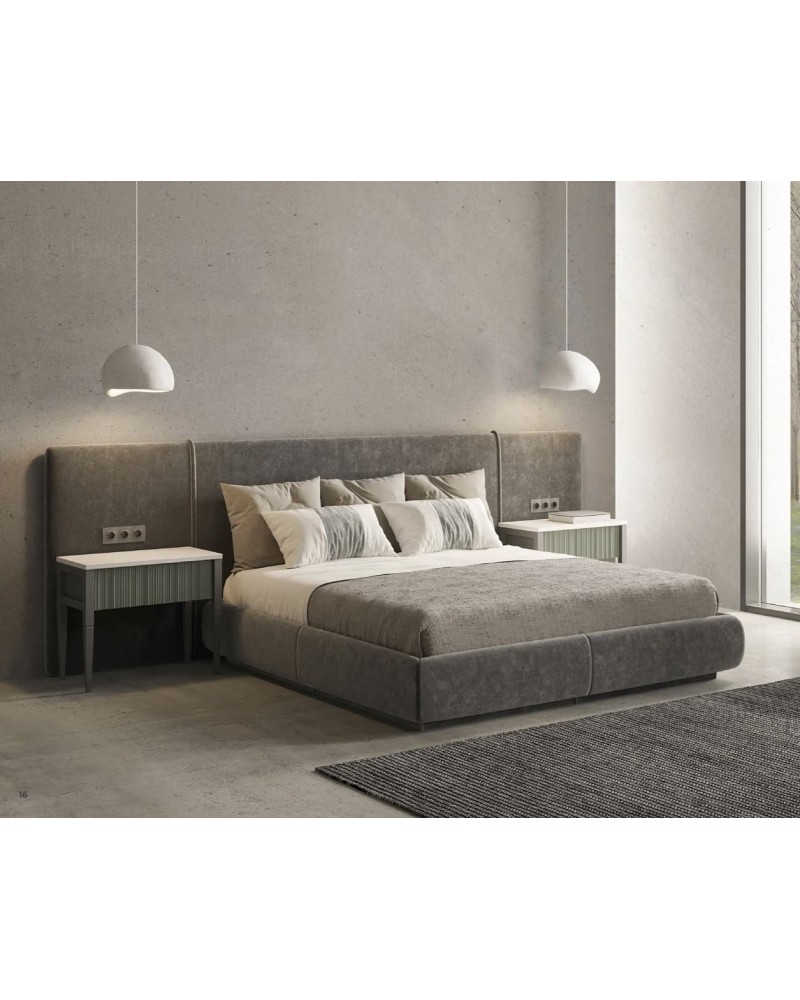 Diseño continuo y elegante: cabezal tapizado a lo ancho y mesitas altas con frente acanalado. Ligereza y estilo para tu dormitorio.