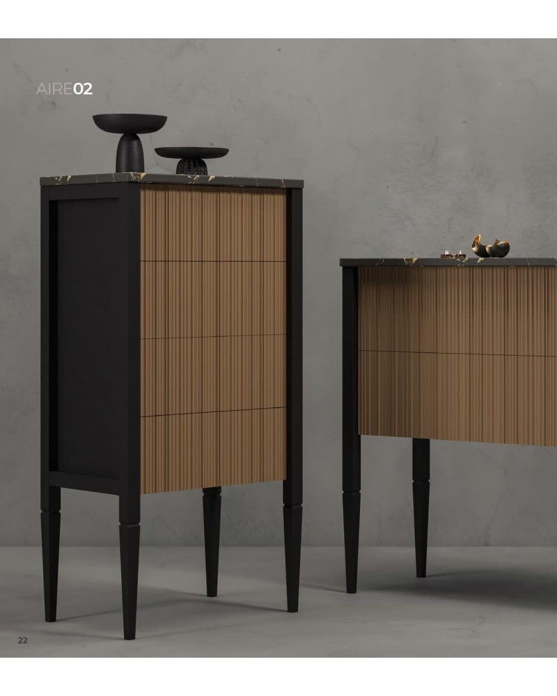 Con su diseño esbelto y funcional, el sinfonier de la colección Aire es la solución perfecta para ganar capacidad sin renunciar al estilo. Sus cuatro cajones con frente acanalado y patas altas refuerzan la estética vertical y liviana del conjunto. Una pieza que combina equilibrio, funcionalidad y diseño moderno, ideal para dormitorios que buscan un toque distintivo.