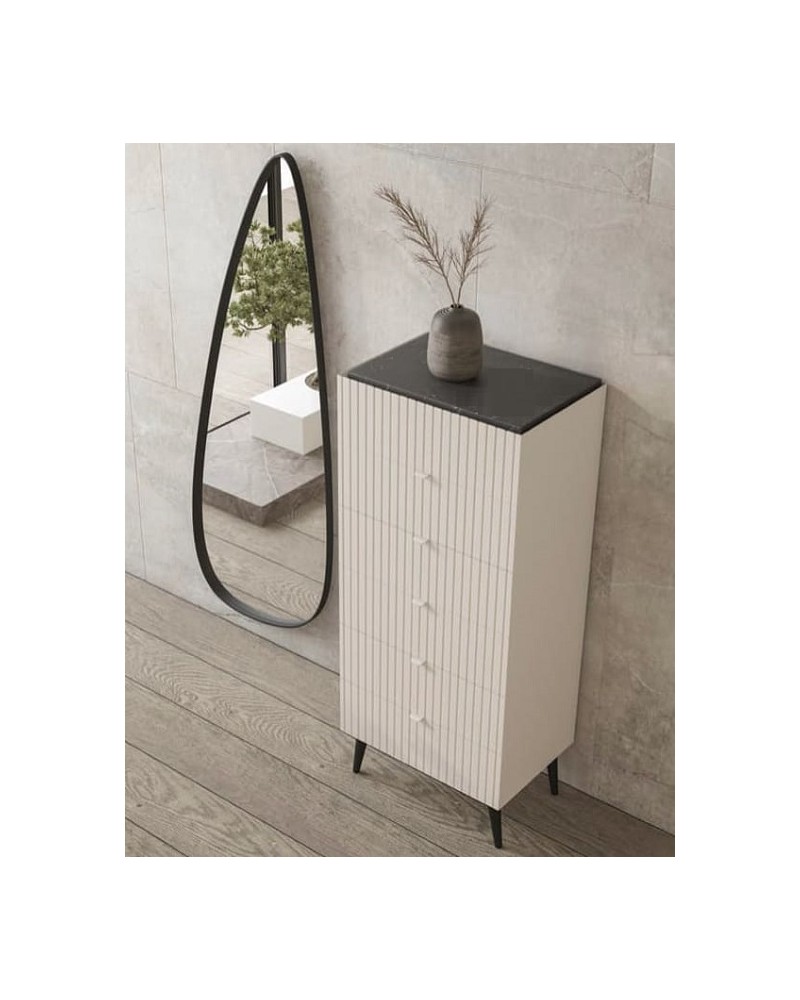El sinfonier Block 01 es la solución ideal para ganar altura y estilo. Su estructura esbelta y vertical, con cinco cajones de frente estriado, sobre en acabado piedra oscura y patas negras, combina capacidad y diseño. Lo acompaña un original espejo vertical tipo gota con marco negro, que suaviza las líneas rectas del mueble y añade un toque orgánico y escultórico al conjunto. Juntos, forman un dúo armónico que equilibra funcionalidad y estética en cualquier rincón del dormitorio.
