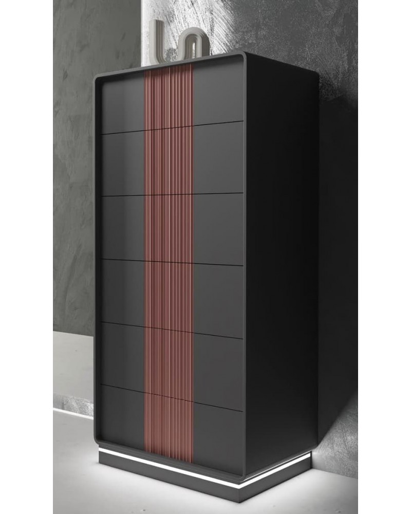 El sinfonier Curve 03 es una solución vertical perfecta para quienes buscan capacidad de almacenaje sin ocupar demasiado espacio. Su diseño curvado en acabado grafito combina con los frentes acanalados en color terracota, creando una pieza con personalidad y sofisticación. Las líneas redondeadas y el equilibrio cromático lo convierten en un mueble funcional que destaca por su estilo contemporáneo.