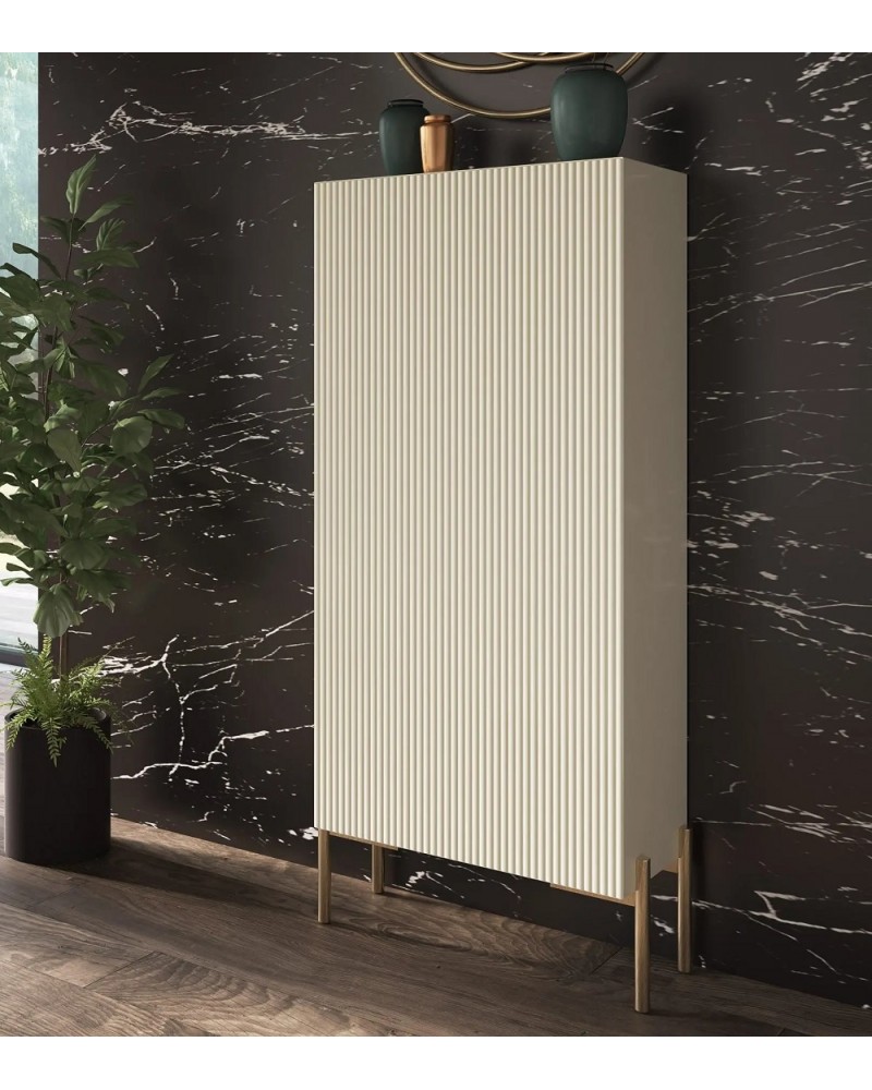Ilumina tu entrada con nuestro zapatero lacado en beige. El contraste entre el beige y el dorado crea un ambiente luminoso y acogedor, perfecto para recibir a tus invitados.