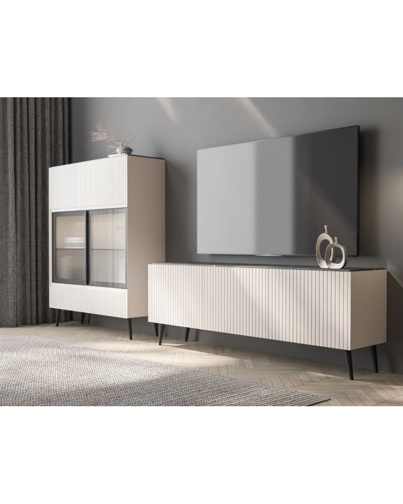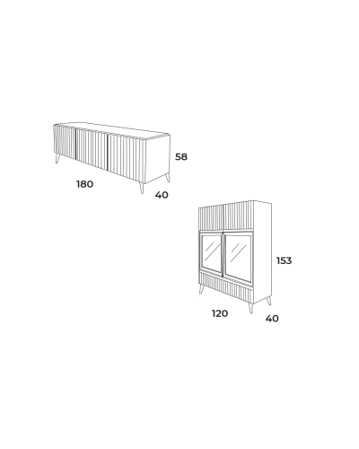 Esta composición combina fuerza estructural con una presencia serena. La composición alterna volúmenes cerrados con vitrinas sutiles, creando un equilibrio entre exhibición y almacenamiento. Las patas estilizadas elevan el conjunto, mientras que el contraste entre el frente estriado claro y el fondo oscuro genera profundidad. Ideal para espacios donde el diseño marca la pauta sin perder calidez.