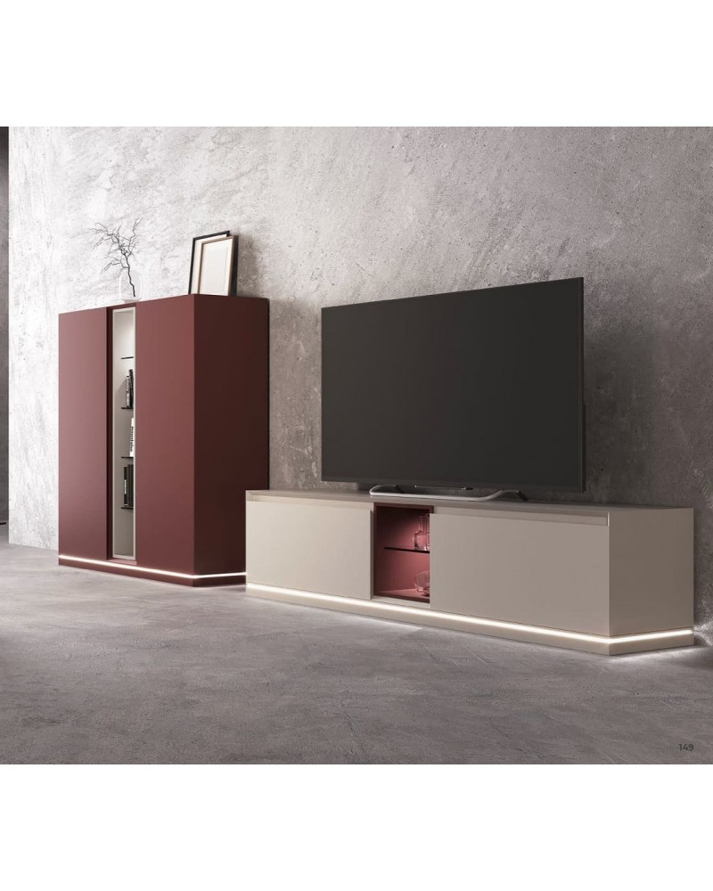 Esta composición despliega una elegancia contenida. El mueble bajo, lacado en beige, alterna una puerta y un cajón con un hueco central iluminado y estante de cristal. El vajillero sigue el mismo lenguaje formal, incorporando una estructura simétrica con puertas laterales y una zona central abierta con estantes de cristal y fondo burdeos, aportando un sutil contraste cromático. La base en zócalo de 6 cm sustituye las patas, reforzando la geometría del conjunto y permitiendo incorporar iluminación LED que realza su presencia arquitectónica.