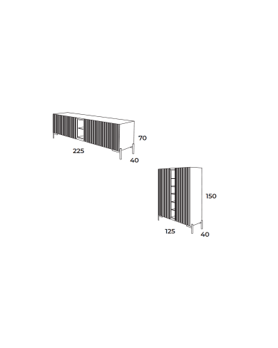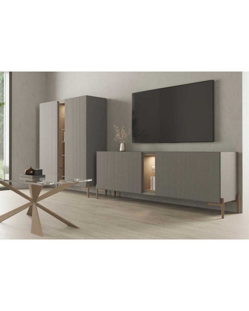 Apuesta por la armonía entre orden, textura y proporción. La composición se construye a partir de volúmenes robustos con frentes estriados que aportan ritmo y elegancia. El contraste sutil entre la laca mate y los detalles en iluminación cálida interior crea una atmósfera envolvente y funcional. Las patas metálicas esbeltas elevan el conjunto, aportando ligereza visual a una propuesta de fuerte presencia arquitectónica.