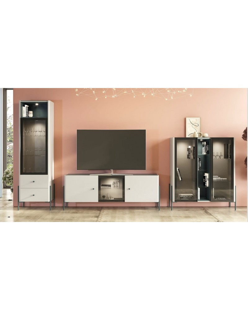 Elegancia curva y carácter contemporáneo definen esta composición de comedor de la colección Nala. Compuesta por un vajillero de gran capacidad (125×40×150 cm), un mueble de TV (155×40×65 cm) con detalle de espejo central, y una vitrina estilizada (65×40×205 cm) con puerta de cristal ahumado negro y cajones inferiores, esta propuesta destaca por su diseño envolvente y sofisticado. Las esquinas suavemente curvadas y las patas metálicas elevan visualmente cada módulo, aportando ligereza y un toque moderno sin perder funcionalidad. Una solución integral para quienes buscan espacios con estilo, calidez y líneas limpias.
