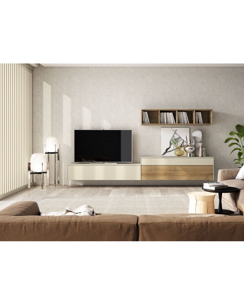 Elegancia y naturalidad en la Composición 10 de la colección Individual de Lanmobel. Este diseño combina el sofisticado acabado Nude lacado con la calidez del Canela efecto madera y la tapa en Harea, logrando un equilibrio perfecto entre modernidad y confort visual. La fachada especial QBIC aporta carácter y relieve, convirtiendo a los módulos bajos en un auténtico protagonista dentro del salón. Con un largo total de 302 cm, esta propuesta ofrece amplitud y presencia, ideal para quienes buscan un mueble de salón versátil, actual y con personalidad propia. Una composición que une estética y practicidad en un único espacio.
