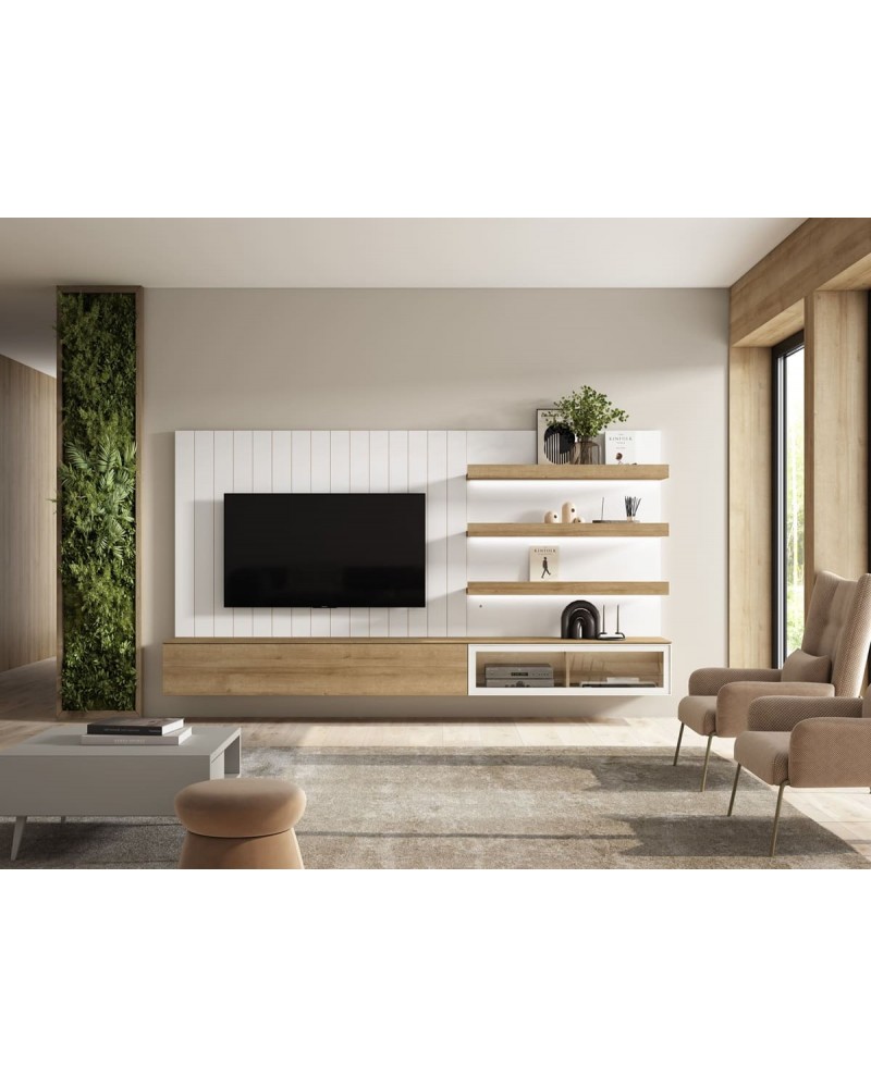 Equilibrio y modernidad en la Composición 13 de la colección Individual de Lanmobel. Su diseño combina líneas depuradas con frentes elegantes y detalles en vidrio que aportan luminosidad y sensación de amplitud. La composición transmite ligereza gracias a sus proporciones bien pensadas, ofreciendo un conjunto contemporáneo que viste el salón con estilo y personalidad.