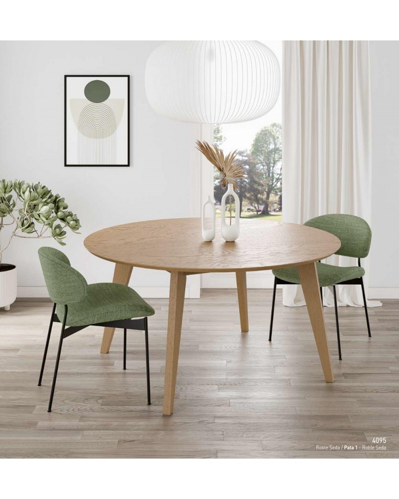 Calidez y estilo atemporal en una mesa de comedor redonda con tapa biselada y patas de madera, ideal para ambientes acogedores y elegantes. Disponible en Ø110x75 cm, Ø120x75 cm y Ø150x75 cm, su diseño armonioso aporta naturalidad y sofisticación a tu hogar.