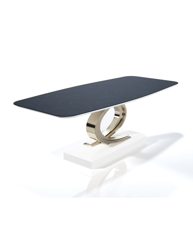 Añade un toque de lujo y sofisticación a tu hogar con nuestra impresionante mesa rectangular de esquinas redondeadas y chaflán, con una elegante tapa en porcelánico negro. La base en blanco contrasta maravillosamente con los intrincados lazos en dorado, creando una pieza central que exuda exclusividad y refinamiento. Ideal para cualquier comedor o sala de reuniones, esta mesa no solo ofrece una funcionalidad excepcional sino también un diseño que cautivará a todos tus invitados, elevando tu espacio a nuevas alturas de elegancia.