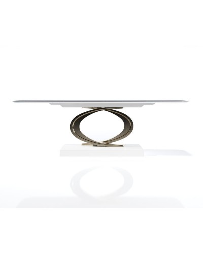 Enamórate de nuestra mesa rectangular con tapa en porcelánico negro, base blanca y lazos en dorado. ¡Transforma tu hogar con lujo y sofisticación!